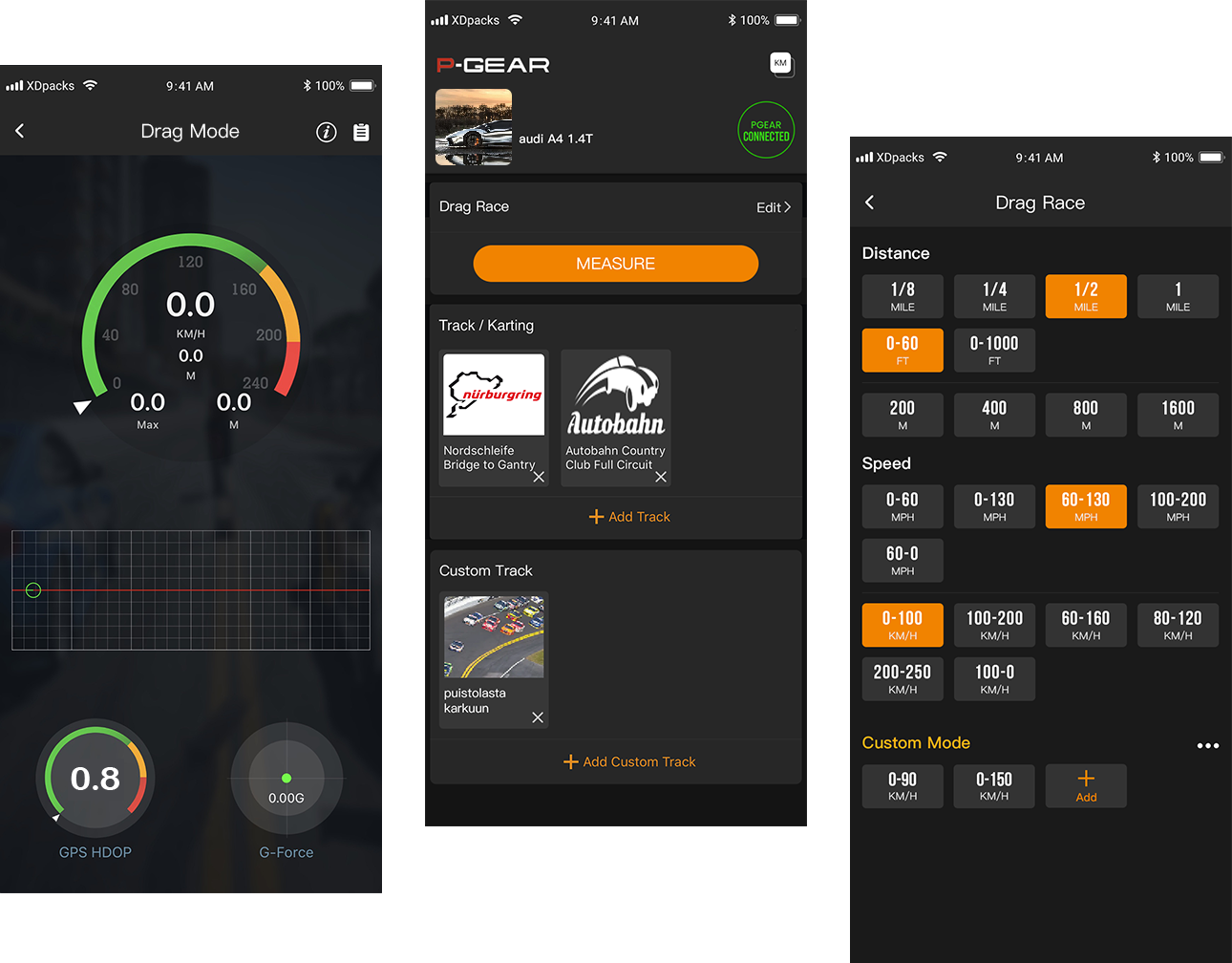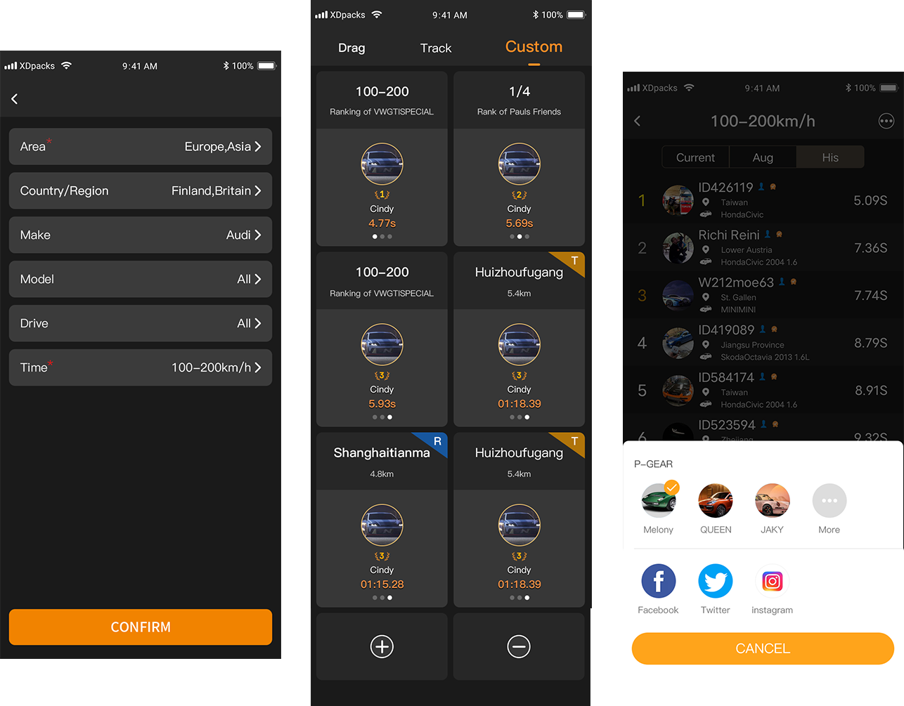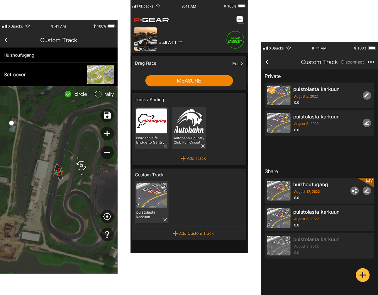 You can customize any track, click the "add" button, and slide your finger on the map to set the starting line and ending line. You can also share this track with your friends.